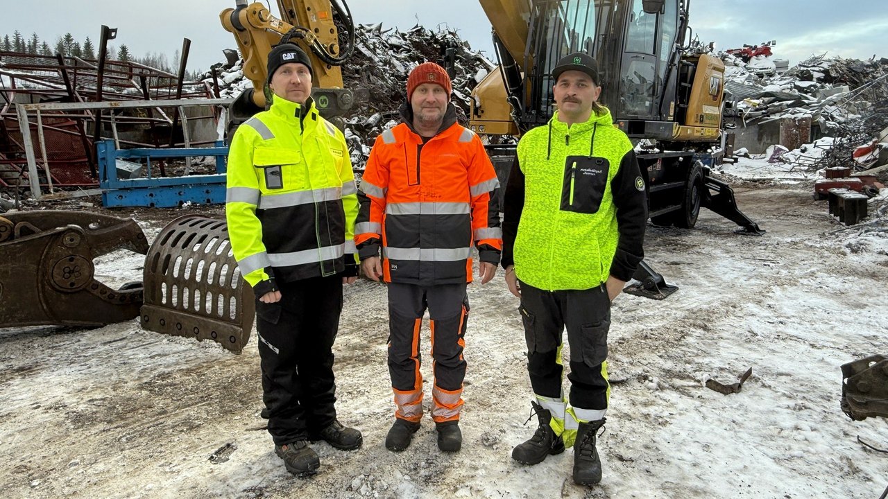 Haastattelussa Metallivälitys Räsänen Oy:n perustaja Pasi Räsänen, koneenkuljettaja Joonas Lind sekä keskellä Avescon tuotepäällikkö Kalle Korhonen.